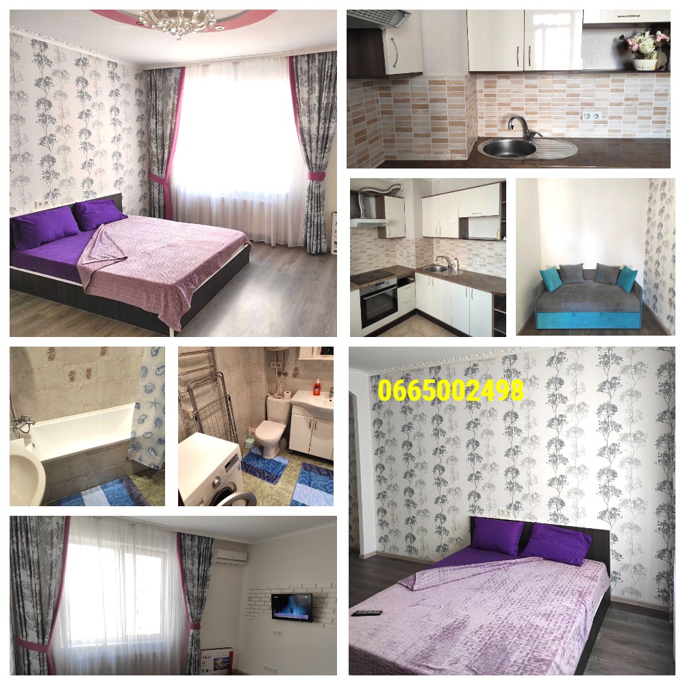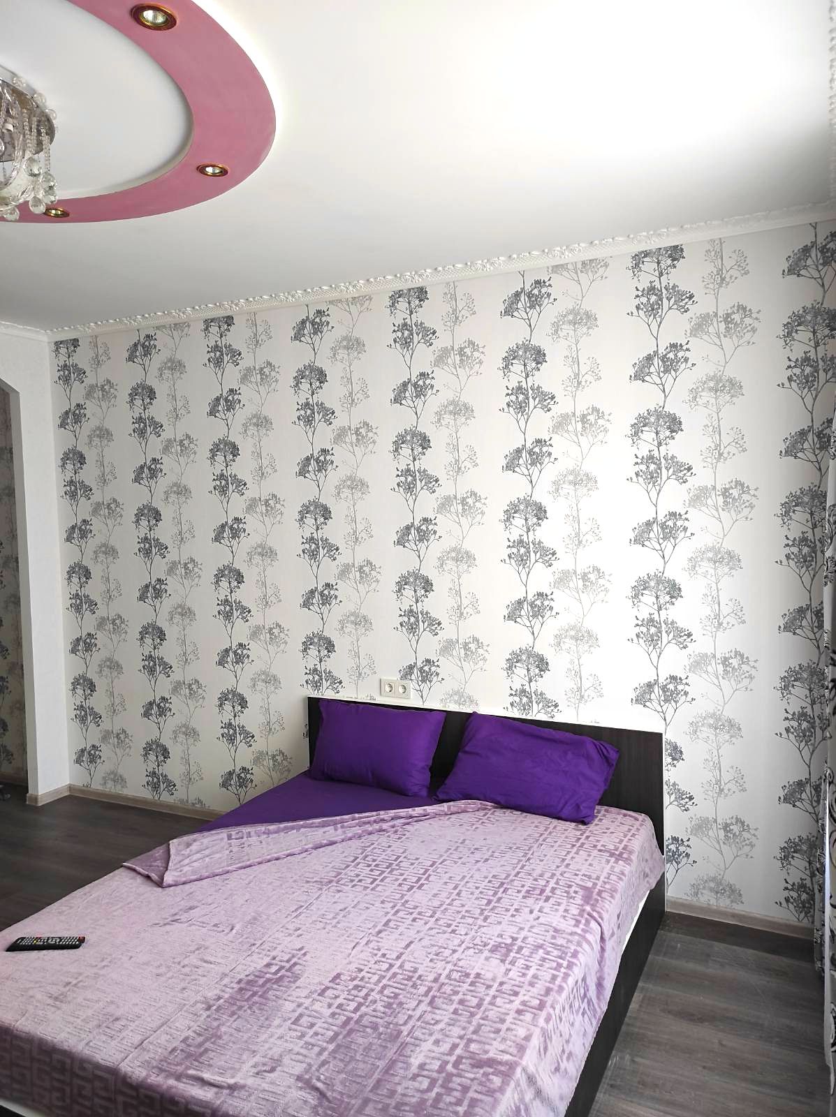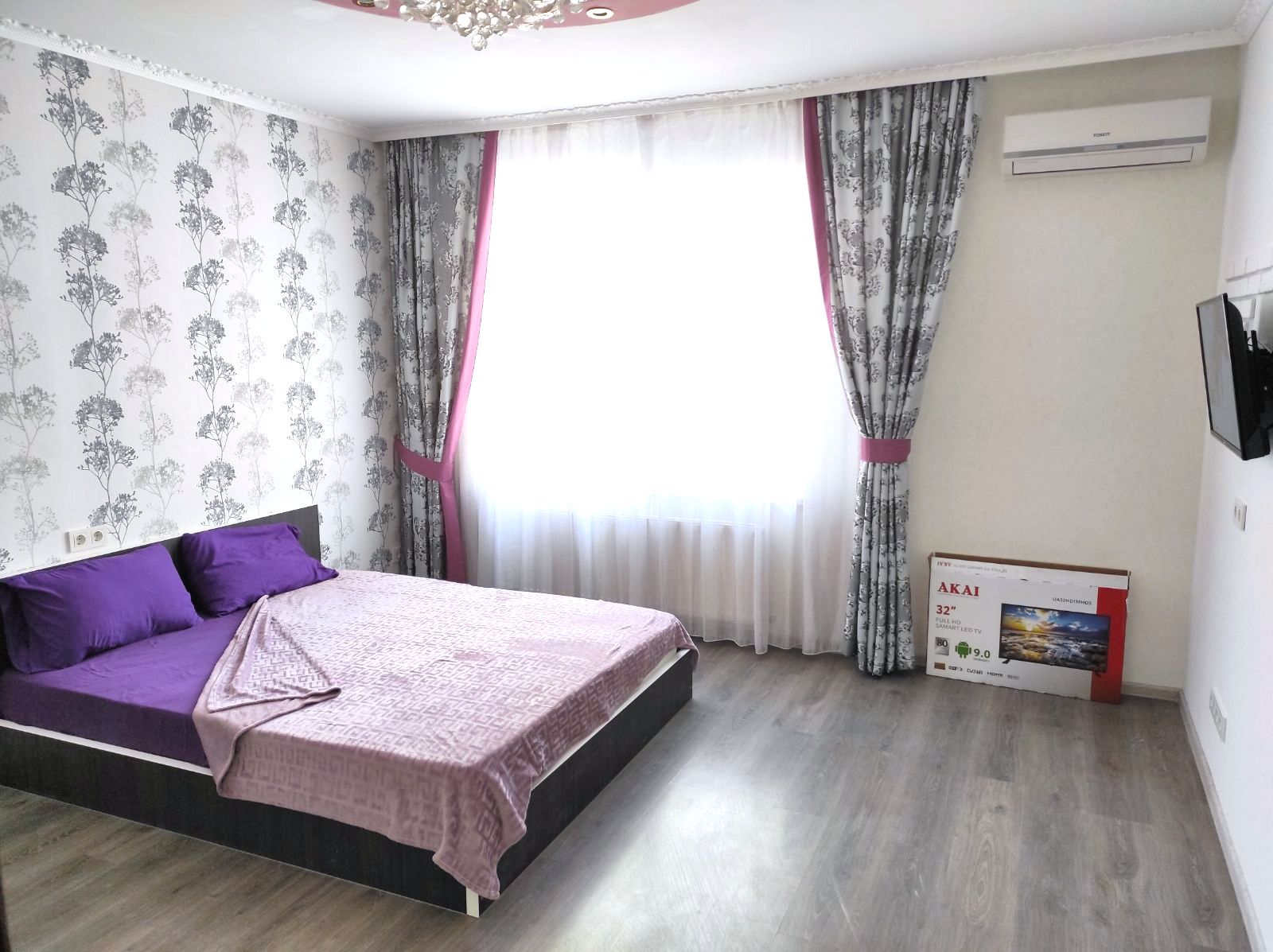 Комната : большая двуспальная кровать ( массив дерево, матрас 160*200 Матролюкс, еще запечатанный), плазменный Тв, современные светильники.