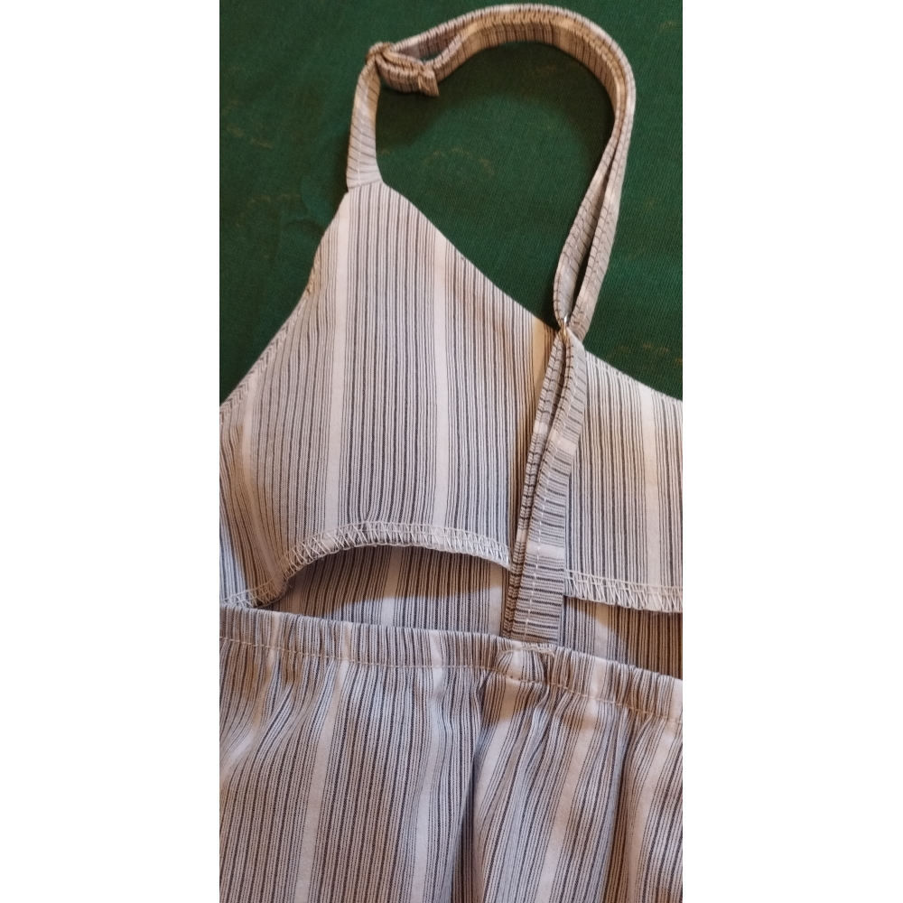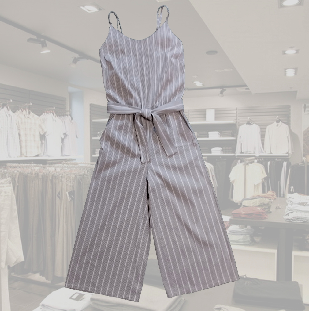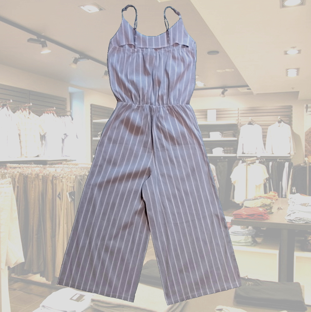 Легкий літній комбінезон з кюлотами, сірий у білу смужку в новому стані, слідів носіння немає. На поясі гумка плюс поясок, дві бічні кишені. Верхня частина ззаду на тонкій гумці, бретельки регулюються. Склад тканини зрізаний, за відчуттями бавовна з еластаном, добре тягнеться. Розмір М-L.