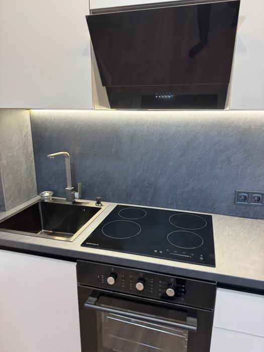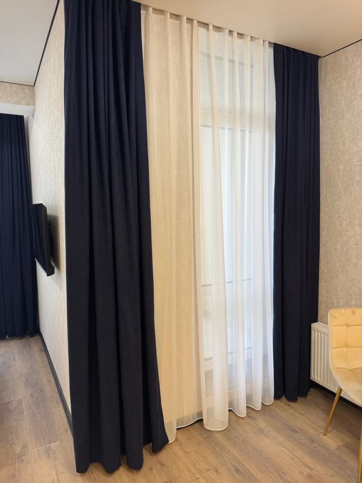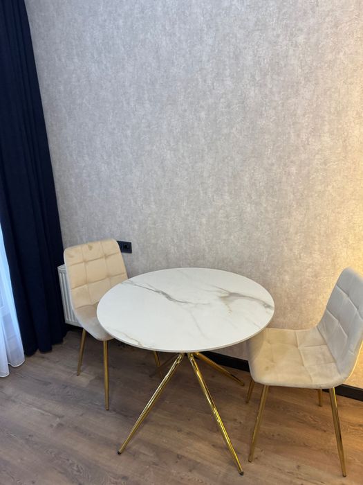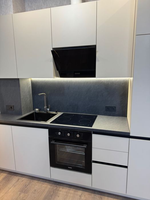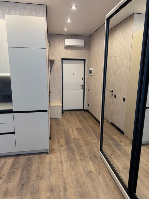 Квартира виконана у сучасному стилі з використанням якісних матеріалів. Вона має висоту стель 3 метри, що створює відчуття простору та світлості.