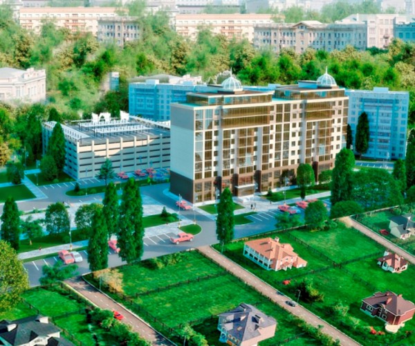 10 этажный дом из красного кирпича дом "премиум класса" на закрытой охраняемой территории с ландшафтным дизайном.